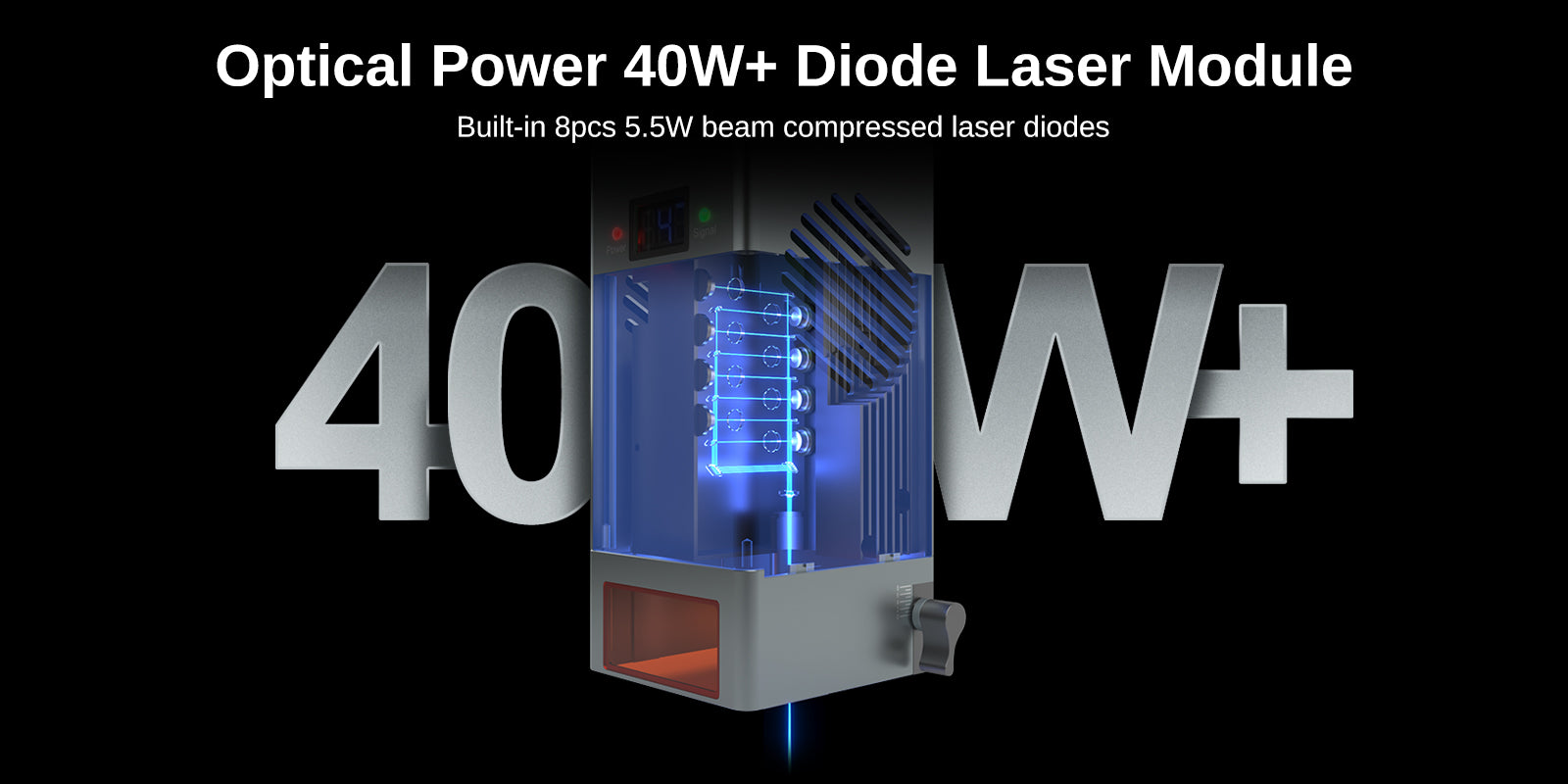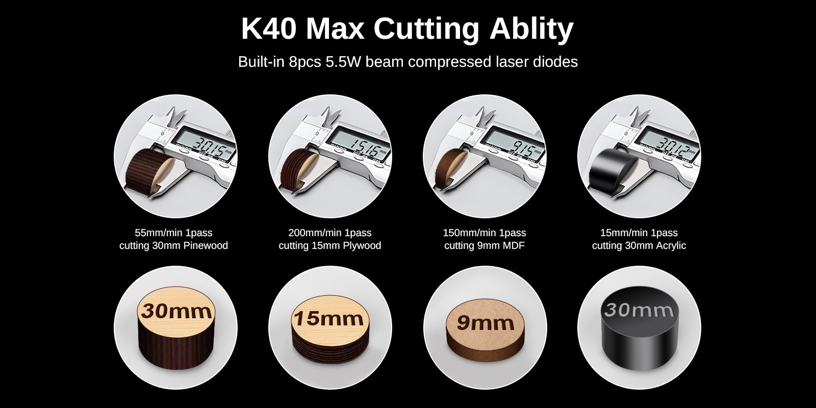 K40 には 8 つの高性能高速軸圧縮ダイオードが内蔵されており、最大 44W の光パワーを供給して高速かつ効率的な切断を実現します。