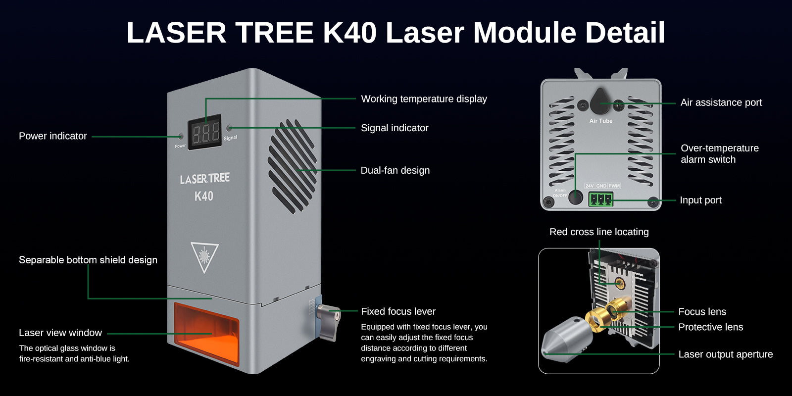 - 🏆内蔵サーミスタ、チューブコア温度のリアルタイム監視により、レーザーモジュールの長期にわたる安全で安定した動作を保証します。