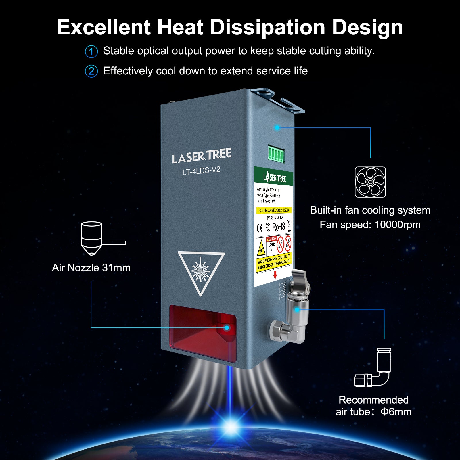 The LT-4LDS-V2 is a professional cutting module designed for long-term safe cutting and fine engraving processes. It is a blue laser head with an output of 20W optical power. Compared with V1, V2 has been greatly improved with a new housing design, easier to use air assist, longer focal length and more stable cutting output power. Cut 10mm of plywood at 3mm/sec at a time, easily creating the desired effect on the pattern. If you spend most of your work time cutting, then the LT-4LDS-V2 will be a good partner for you.