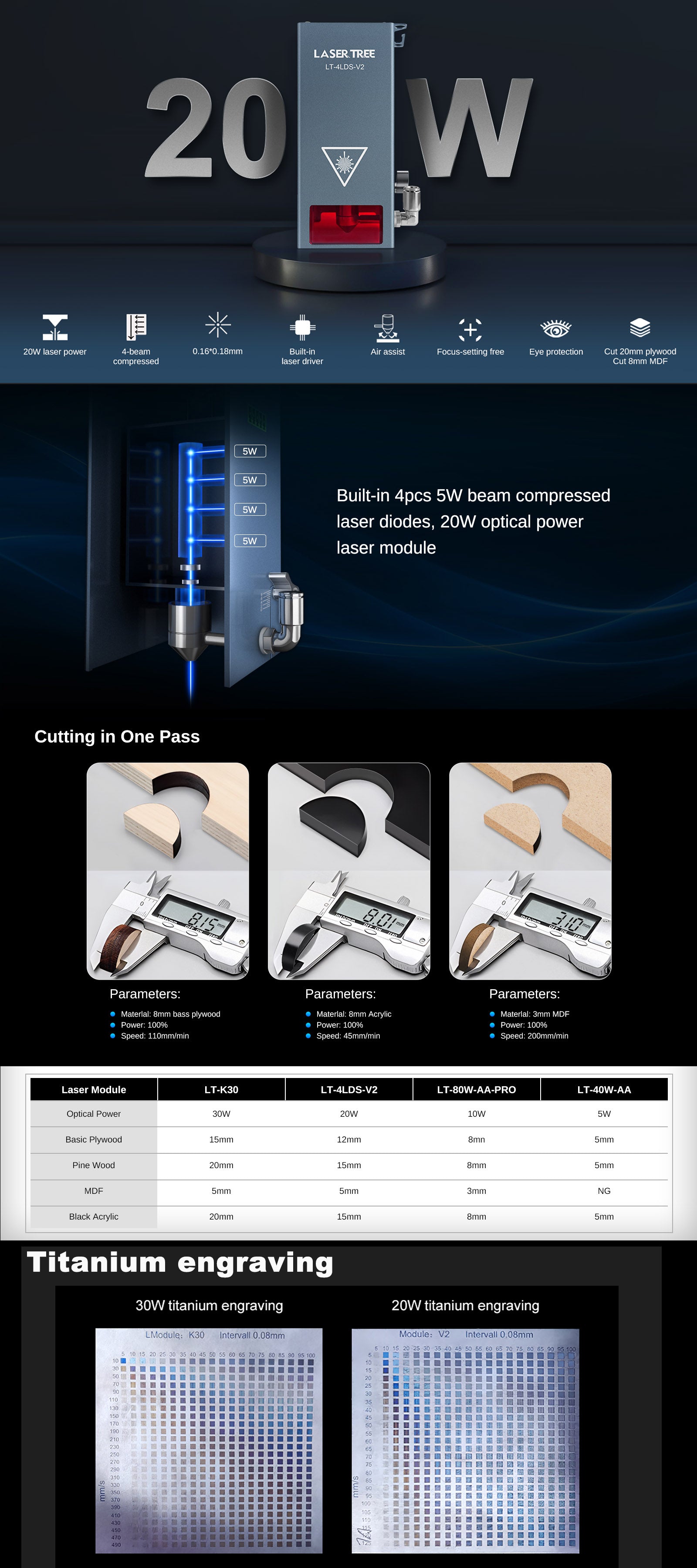 20W optical power laser module. This laser cutting module is capable of cutting 10mm bass plywood and 8mm black acrylics in one pass.