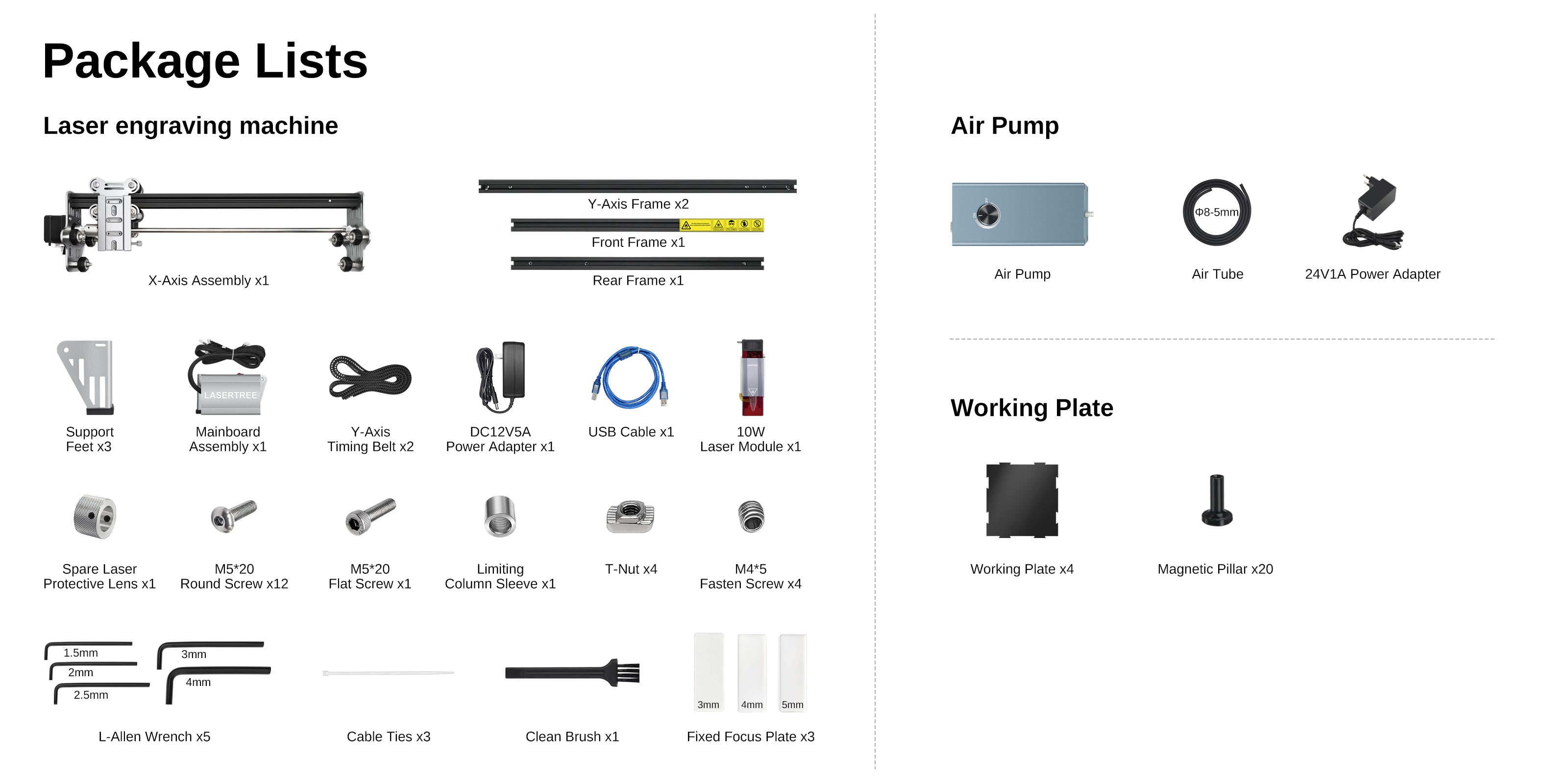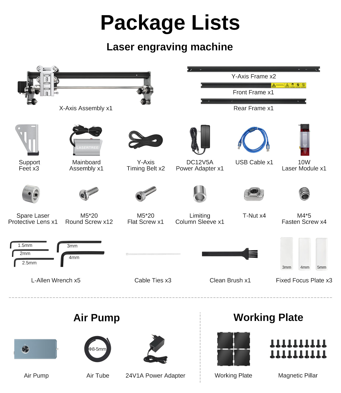 Machine + work plate + air pump, Laser Tree K1 Mini offers you a complete set of accessories. The laser engraving machine uses a 10W laser module to cut 8mm plywood in a single pass, with a laser spot as small as 0.08 mm for finer engraving. The work plate works in conjunction with an air pump to remove debris and remove smoke, avoiding yellowing of the wood and allowing you to realize most of your creations.
