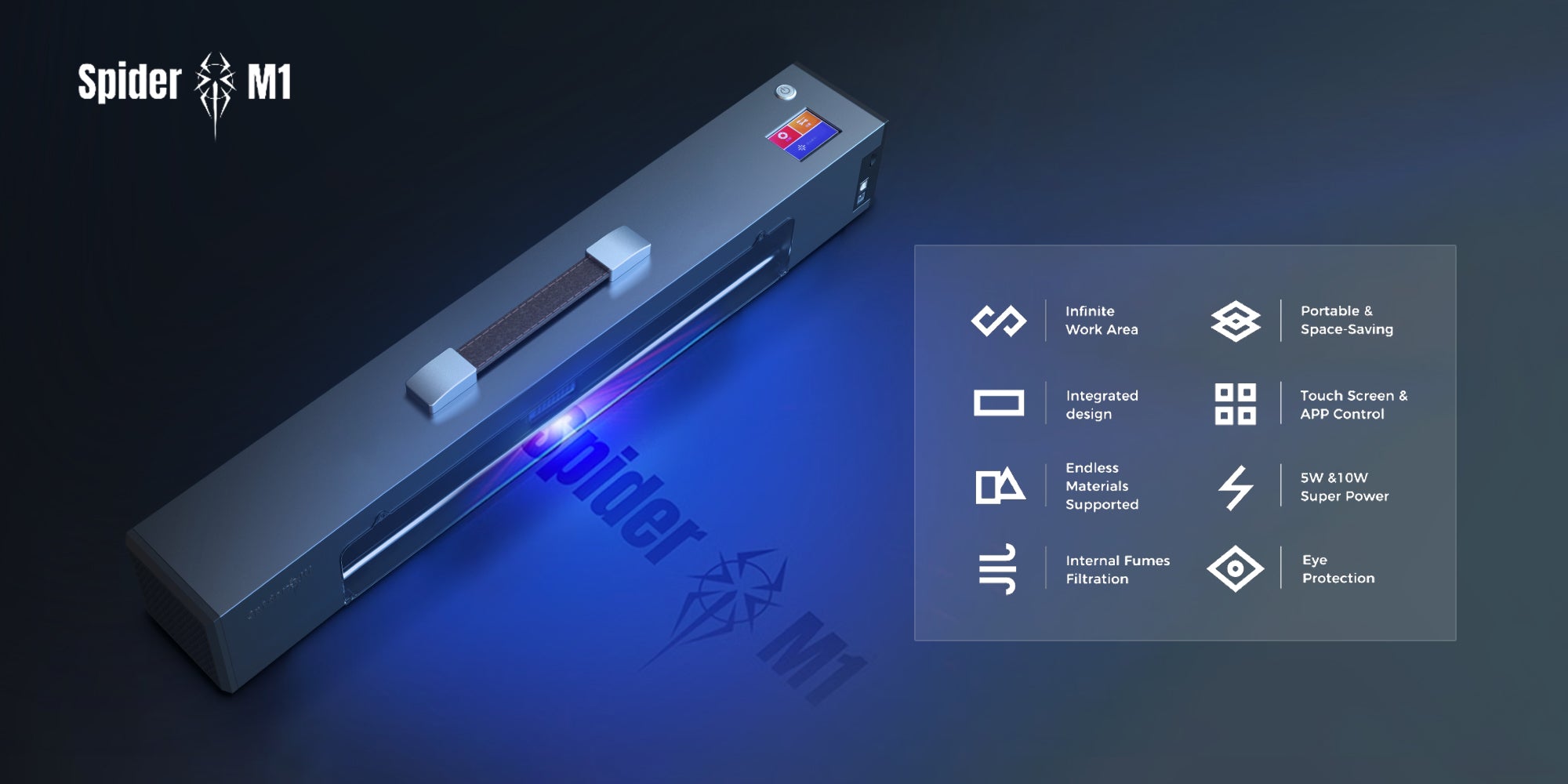 Fully integrated smoke and fume filter system provides a totally safe and odor-free environment. The enclosed structure and safety cap protect your eyes from any laser harm. Quiet engraving and cutting provides a workstation that never disturbs your daily routine. So much power and versatility packed into such a slim design. Spider M1 is ready to take your laser engraving & cutting experience to the next level.